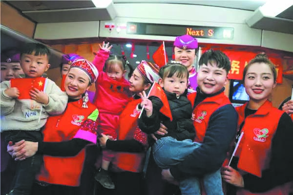 在贵阳至毕节站的高铁上,“志愿”闹新春“爱心”上高铁活动热热闹闹,志愿者们为旅客送上春联、福字和年画,用歌声为大家送上新年的祝福,车厢内交织着歌声、掌声和笑声。