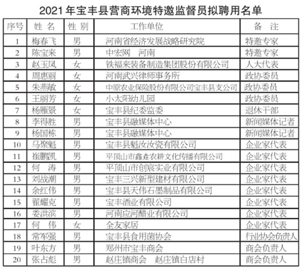 根据《河南省优化营商环境条例》和中共宝丰县委营商环境建设委员会《关于制定宝丰县优化营商环境特邀监督员制度工作方案》的要求,县委营商办组织了2021年度宝丰县营商环境特邀监督员推荐选聘工作。经有关部门和单位推荐,县委营商办复核,初步确定20名宝丰县营商环境特邀监督员,为发挥社会各界监督作用,现将营商环境特邀监督员拟聘用名单予以公示。公示期为2021年7月14日——7月22日(7个工作日)。如有质疑,请于7月22日前将有关情况和证明材料以书面(实名)形式,反馈至宝丰县营商环境建设委员会办公室,或将电子版发至工作邮箱。