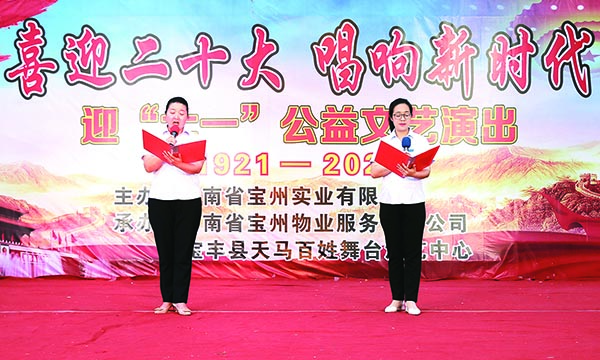 “七一”建党节来临之际,宝州实业公司特邀当地知名文艺工作者,举办周末公益“喜迎二十大,唱响新时代”庆“七一”颂歌献给党文艺活动,吸引了广大群众及戏曲音乐爱好者观看演出,不时博得观众阵阵掌声。歌曲《再唱山歌给党听》《为了谁》《出征》等一首首颂歌唱出了对党的忠诚、对党的热爱,表达了全县人民祝愿祖国繁荣富强的美好心愿。 王双正 摄影报道
