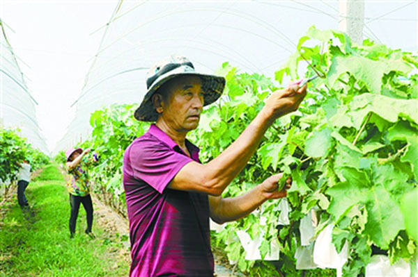 9月14日,宝丰县煌荣农业科技发展有限公司相关负责人李战芳(前)带领群众对葡萄进行后期管理。