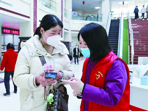 门诊大厅,开水、中药代茶饮、轮椅、雨伞、自助服务综合一体机等便民设施一应俱全。身穿红马甲的志愿者穿梭在就诊患者之间(如图),解答患者的咨询、引导患者就诊、协助患者办理就诊卡、自助缴费、打印影像片子……干净整洁的环境中到处都弥漫着文明之风。