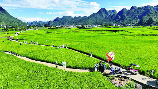 夏日时节,贵州省黔西南布依族苗族自治州兴义市万峰林景区绿意盎然的水稻与村庄、道路、远山相互映衬,构成了一幅幅欣欣向荣的夏日田园美丽画卷。来源:人民网