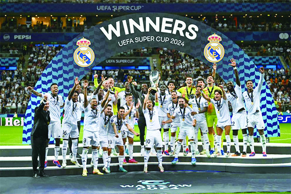 8月14日,在波兰华沙举行的2024欧洲超级杯比赛中,西甲皇家马德里队2比0战胜意甲亚特兰大队,获得冠军。 来源:新华网