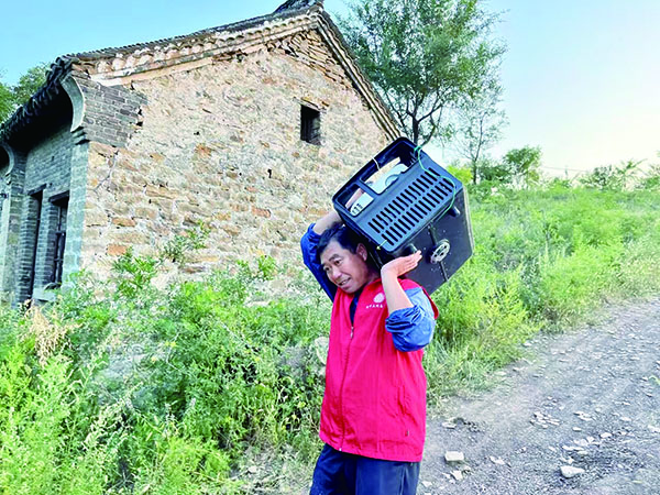 张玉山肩扛放映设备走在山路上