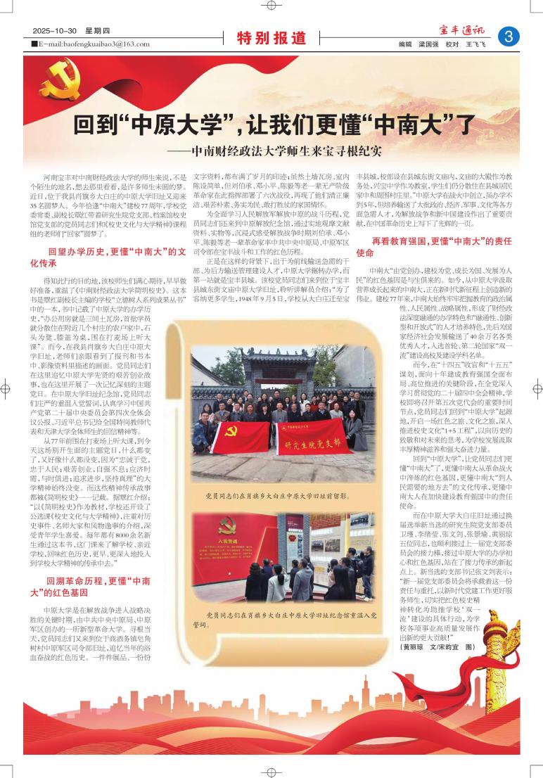 而今,在“十四五”收官和“十五五”谋划,面向十年建成教育强国全面布局、高位推进的关键阶段,在全党深入学习贯彻党的二十届四中全会精神,学校即将召开第五次党代会的重要时间节点,党员同志们回到“中原大学”起源地,开启一场红色之旅、文化之旅,深入推进校史文化“1+5工程”,以向历史的致敬和对未来的思考,为学校发展汲取丰厚精神滋养和强大奋进力量。